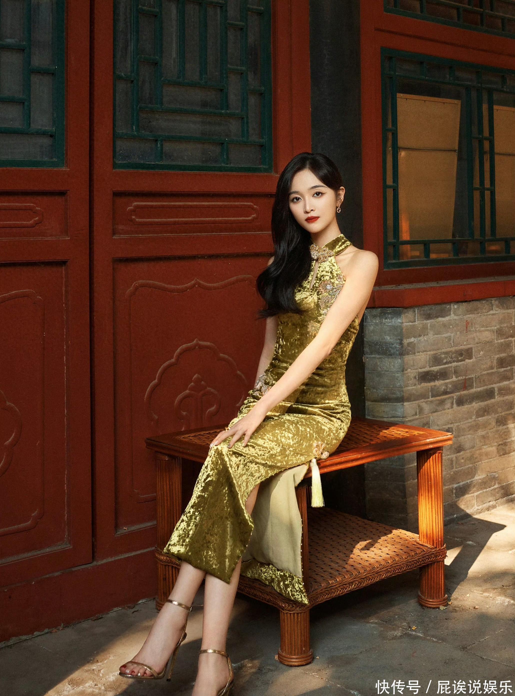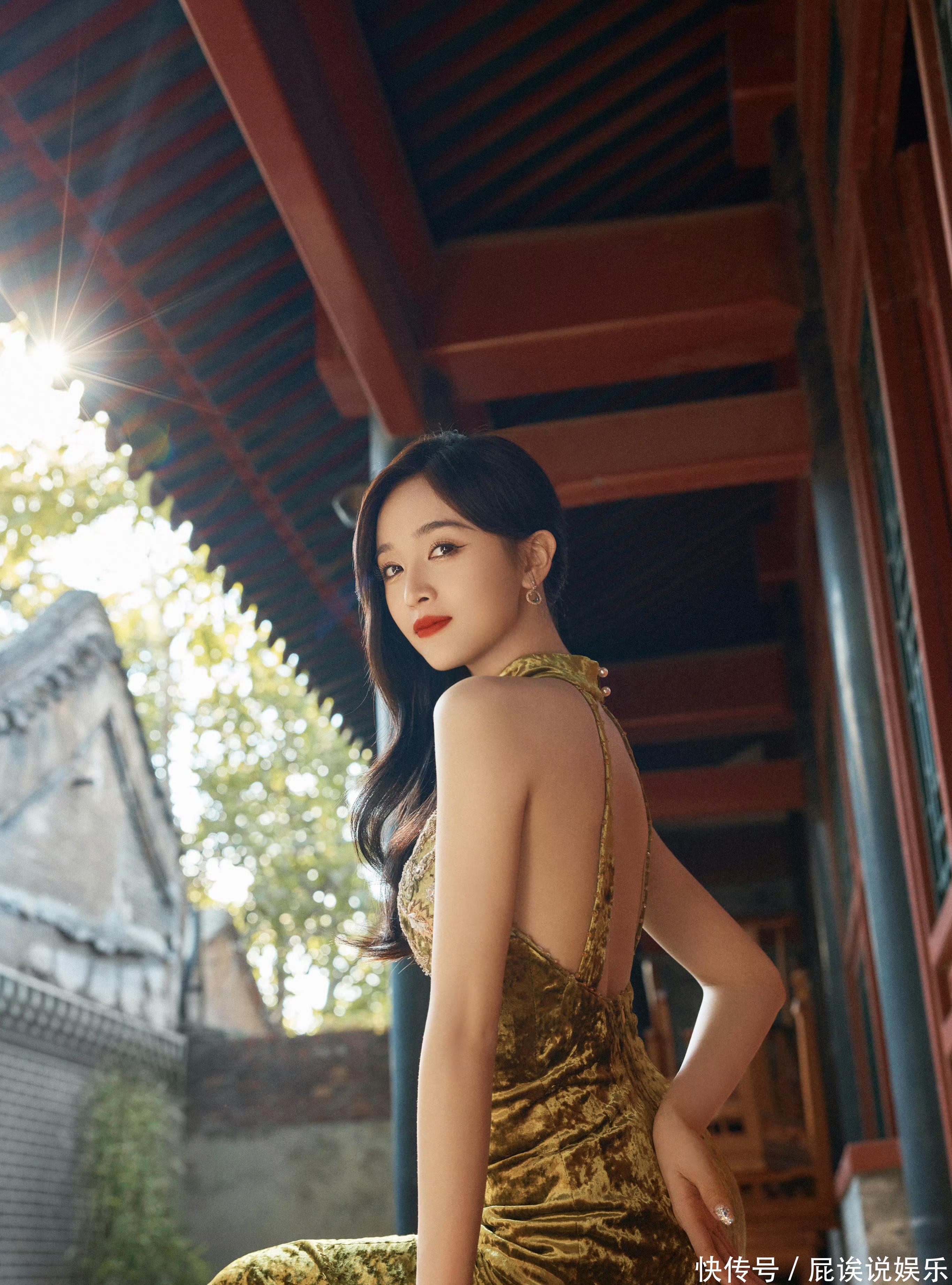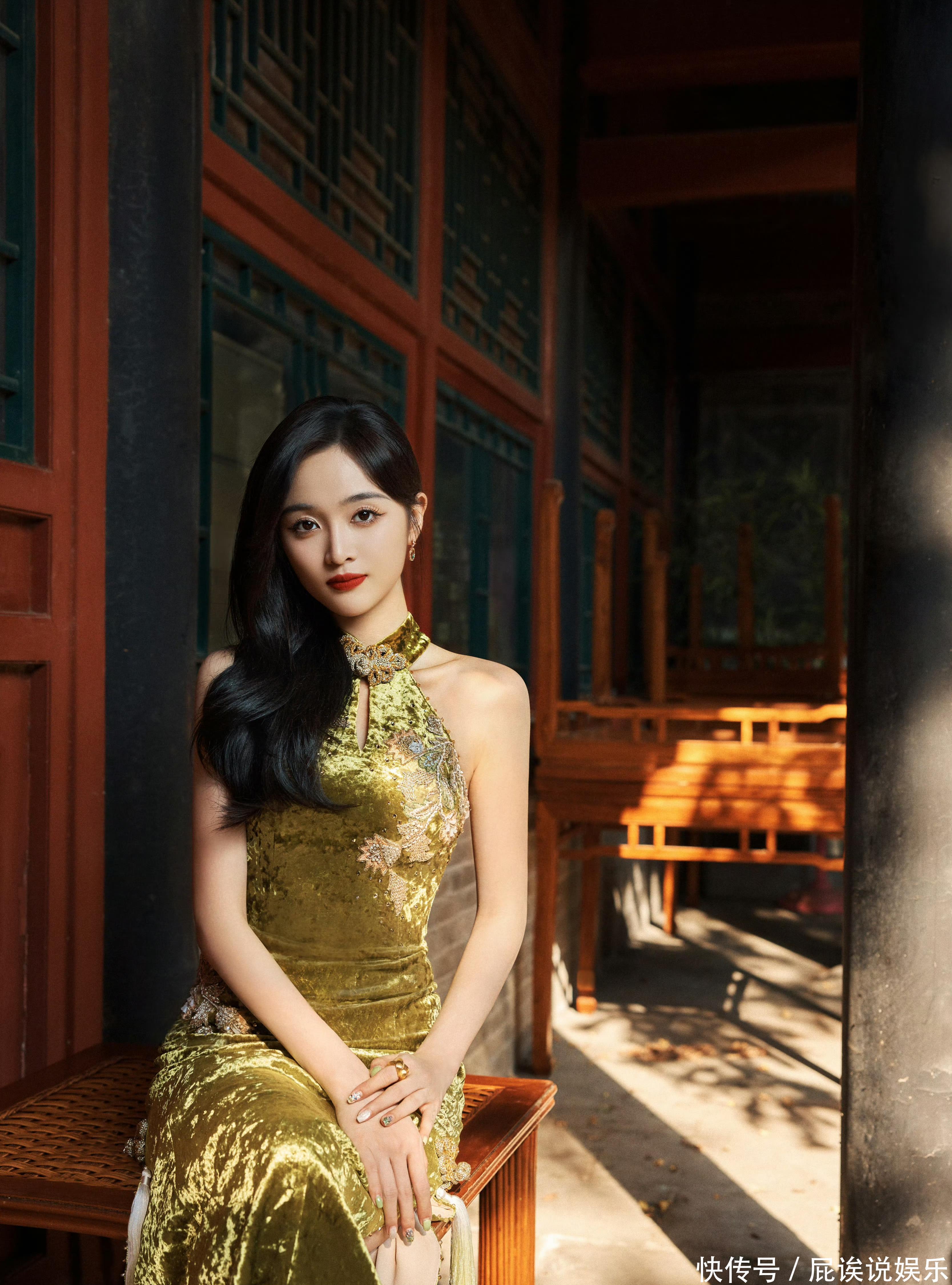 这袭鎏金旗袍堪称点睛之笔,丝绒面料自带高级光泽,复古的挂脖设计露出优美的肩颈线条,后背的镂空剪裁又添几分性感,开叉裙摆则将窈窕身段展现得淋漓尽致。金绿色调与古建的朱红立柱、青灰砖瓦形成鲜明对比,古典韵味中糅合着摩登气息,打破了大众对旗袍的刻板印象。