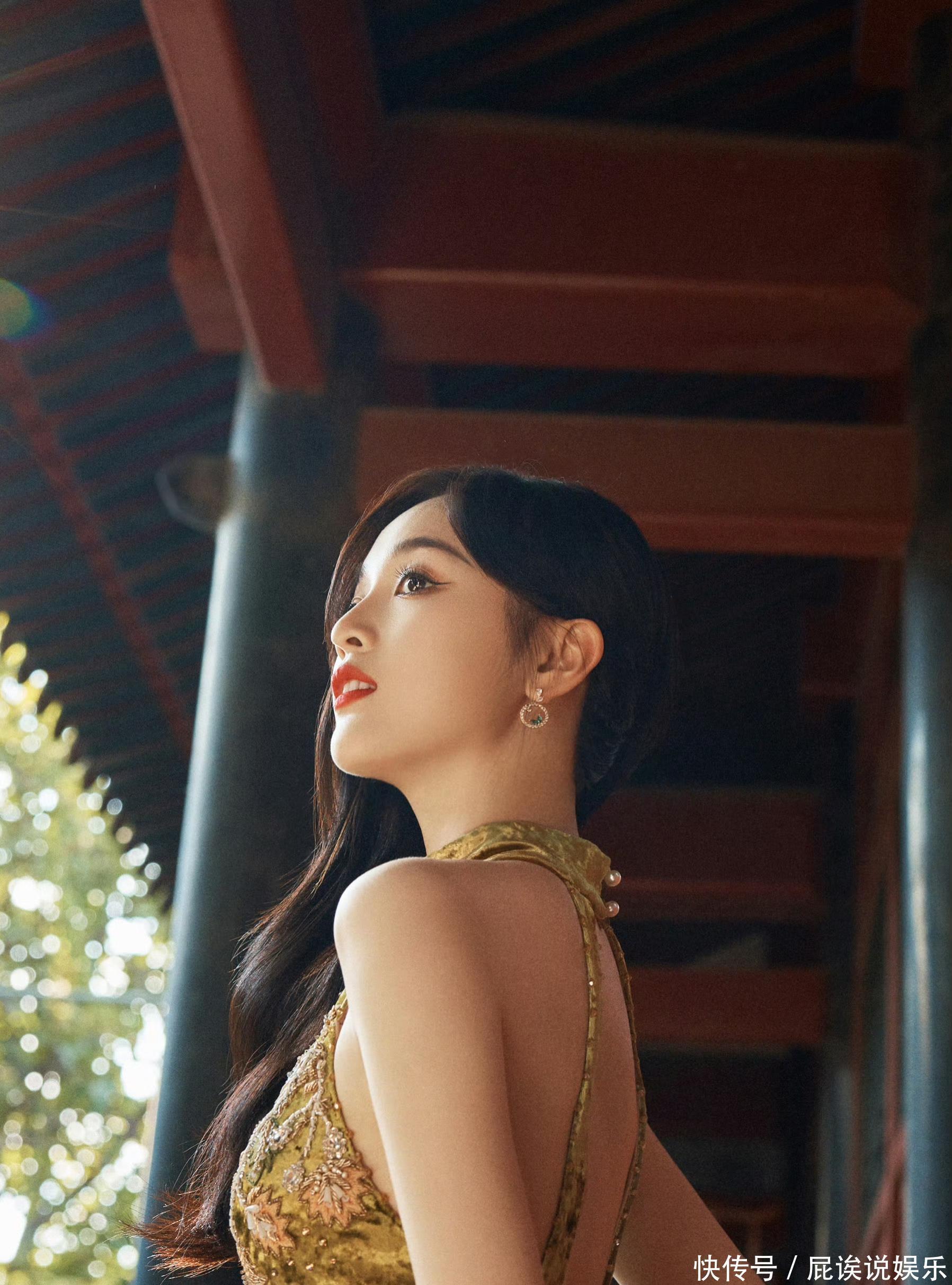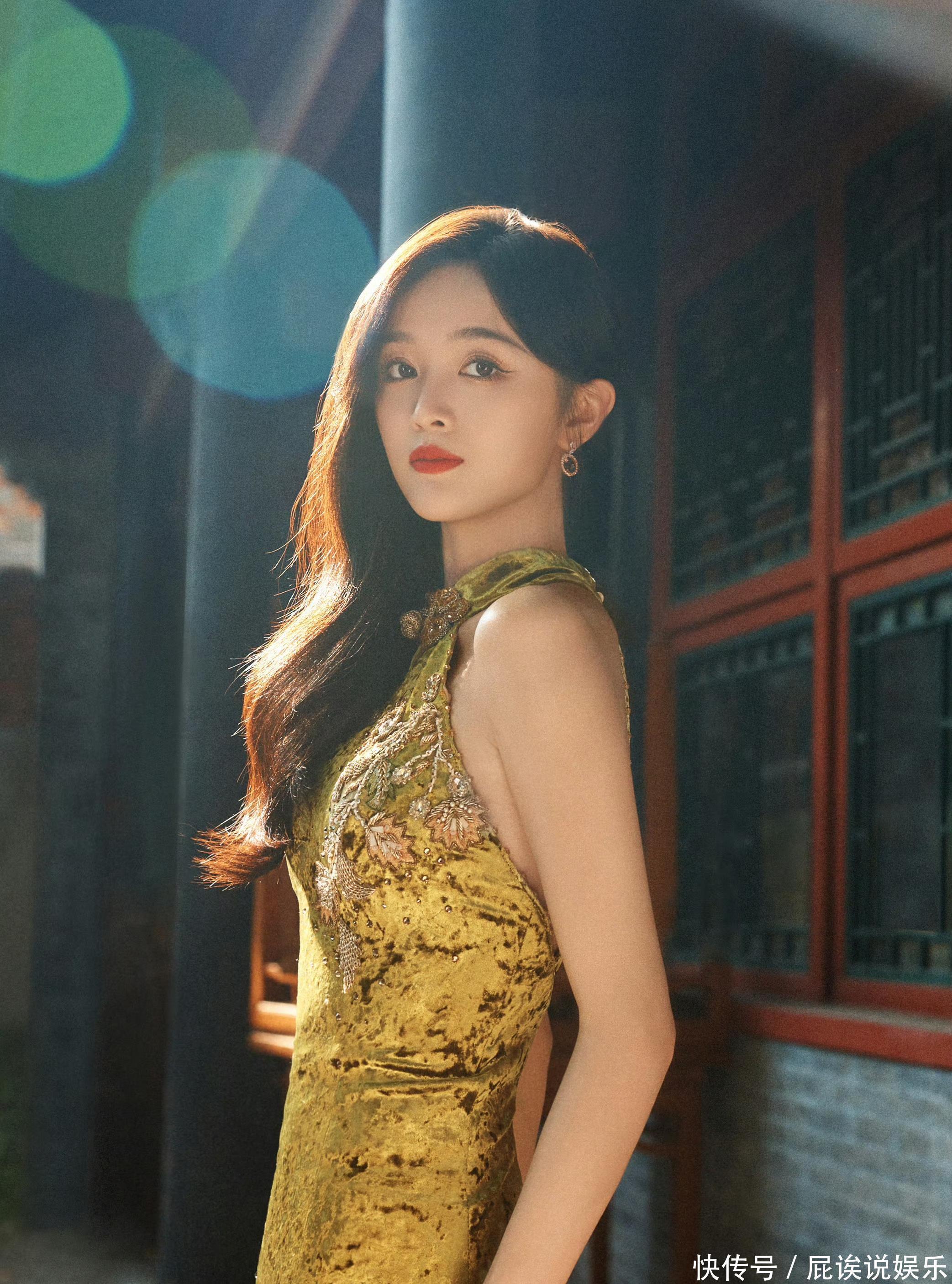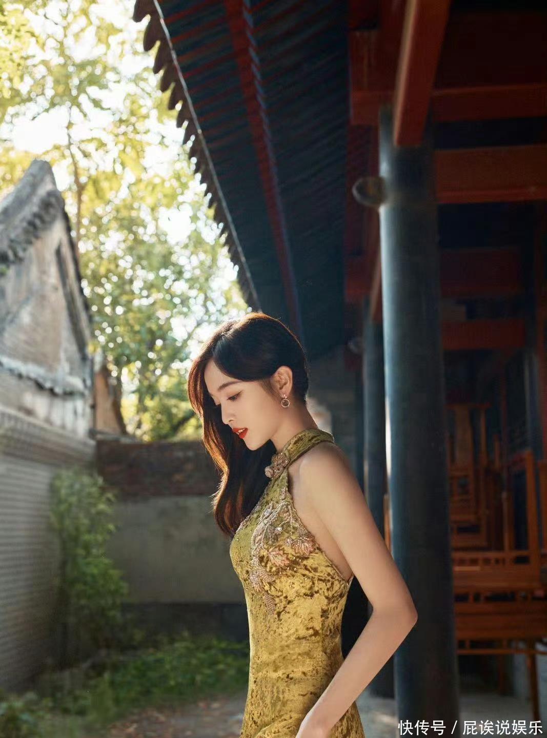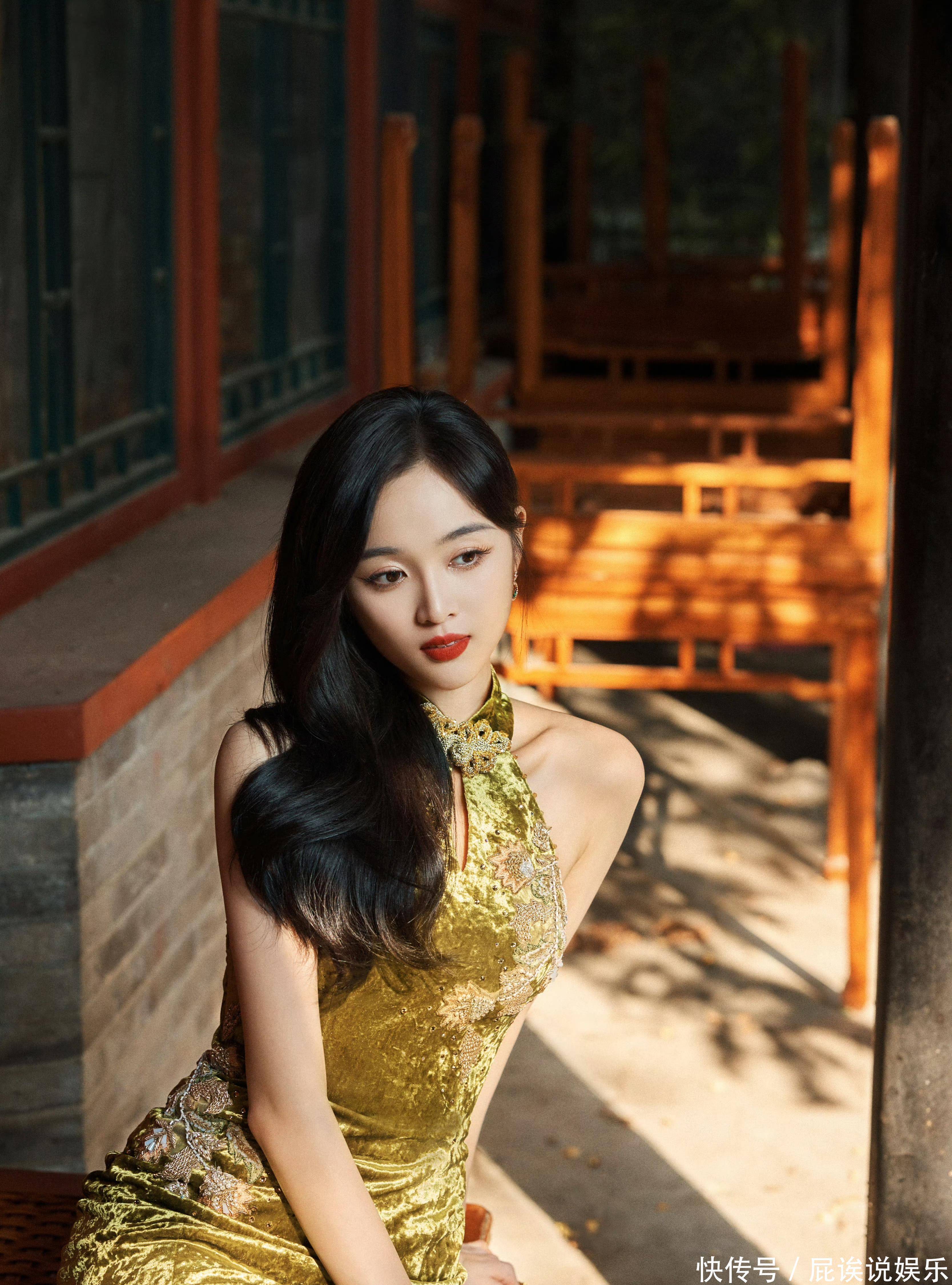 这袭鎏金旗袍堪称点睛之笔,丝绒面料自带高级光泽,复古的挂脖设计露出优美的肩颈线条,后背的镂空剪裁又添几分性感,开叉裙摆则将窈窕身段展现得淋漓尽致。金绿色调与古建的朱红立柱、青灰砖瓦形成鲜明对比,古典韵味中糅合着摩登气息,打破了大众对旗袍的刻板印象。