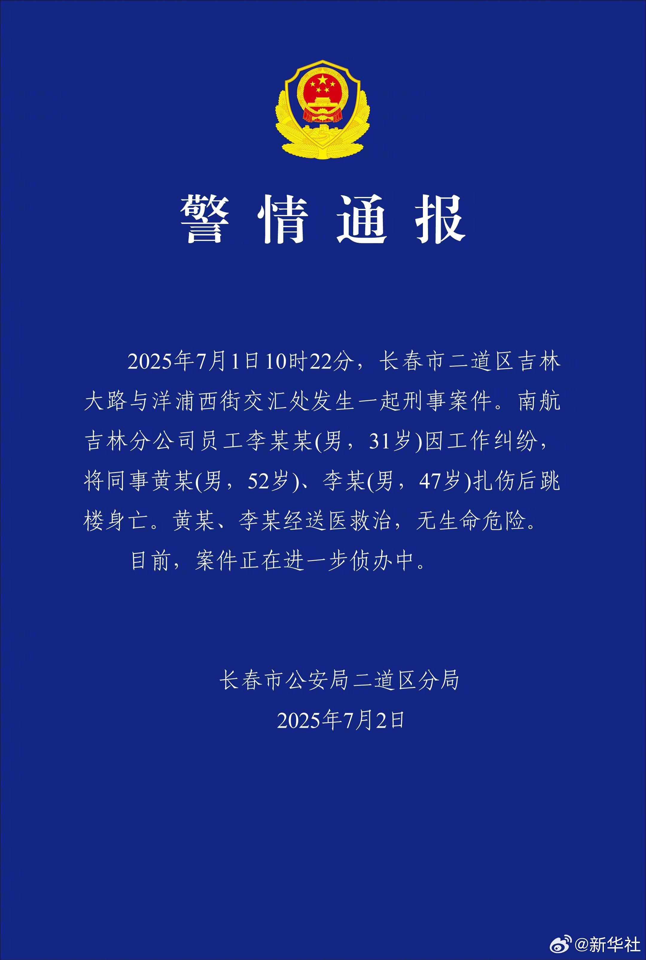 长春市公安局二道区分局发布警情通报:2025年7月1日10时22分,长春市二道区吉林大路与洋浦西街交汇处发生一起刑事案件。南航吉林分公司员工李某某(男,31岁)因工作纠纷,将同事黄某(男,52岁)、李某(男,47岁)扎伤后跳楼身亡。黄某、李某经送医救治,无生命危险。目前,案件正在进一步侦办中。